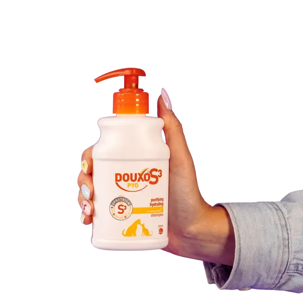 DOUXO S3 PYO הוא שמפו אנטיספטי אוניברסלי שמתאים לכלבים וחתולים עם זיהומים חיידקיים או פטרייתיים, הוא מנקה, מחזק את מחסום העור ומאזן את המיקרוביום של העור בעדינות וביעילות. מותיר את הפרווה רכה ומבריקה עם ריח עדין ונעים, כולל 3% כלורת’קסידין לניקוי אנטיספטי ו-0.5% Ophytrium™ לחיזוק מחסום ה עור, איזון הפלורה והקלה על גירוי. פורמולה עדינה, נטולת סבונים, סולפטים, פראבנים, צבעים, פטלטים, סיליקון וננו-חומרים, ונוסה קלינית להורדה משמעותית של חיידקים ושמרים תוך כ-7 ימים ועם תוצאות מקסימליות לאחר 3 שבועות שימוש רציף.