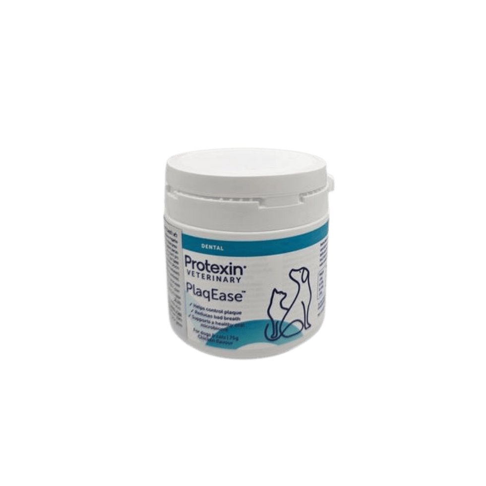 Protexin Veterinary PlaqEase היא אבקת דנטלית יומית שנועדה לתמוך בבריאות הפה של כלבים וחתולים ולסייע בשליטה על פלאק וריח רע מהפה. האבקה משלבת תערובת ייחודית של פוסטביוטיקה, פרה-ביוטיקה, אצות ולימון ויטמין C, שתומכים במיקרוביום האורלי ובמערכת העיכול, מקלים על הצטברות פלאק ומסייעים להעניק נשימה רעננה. את האבקה ניתן לפזר בקלות על מזון יבש או רטוב, והיא בטעם עוף שמועדף על חיות מחמד.
