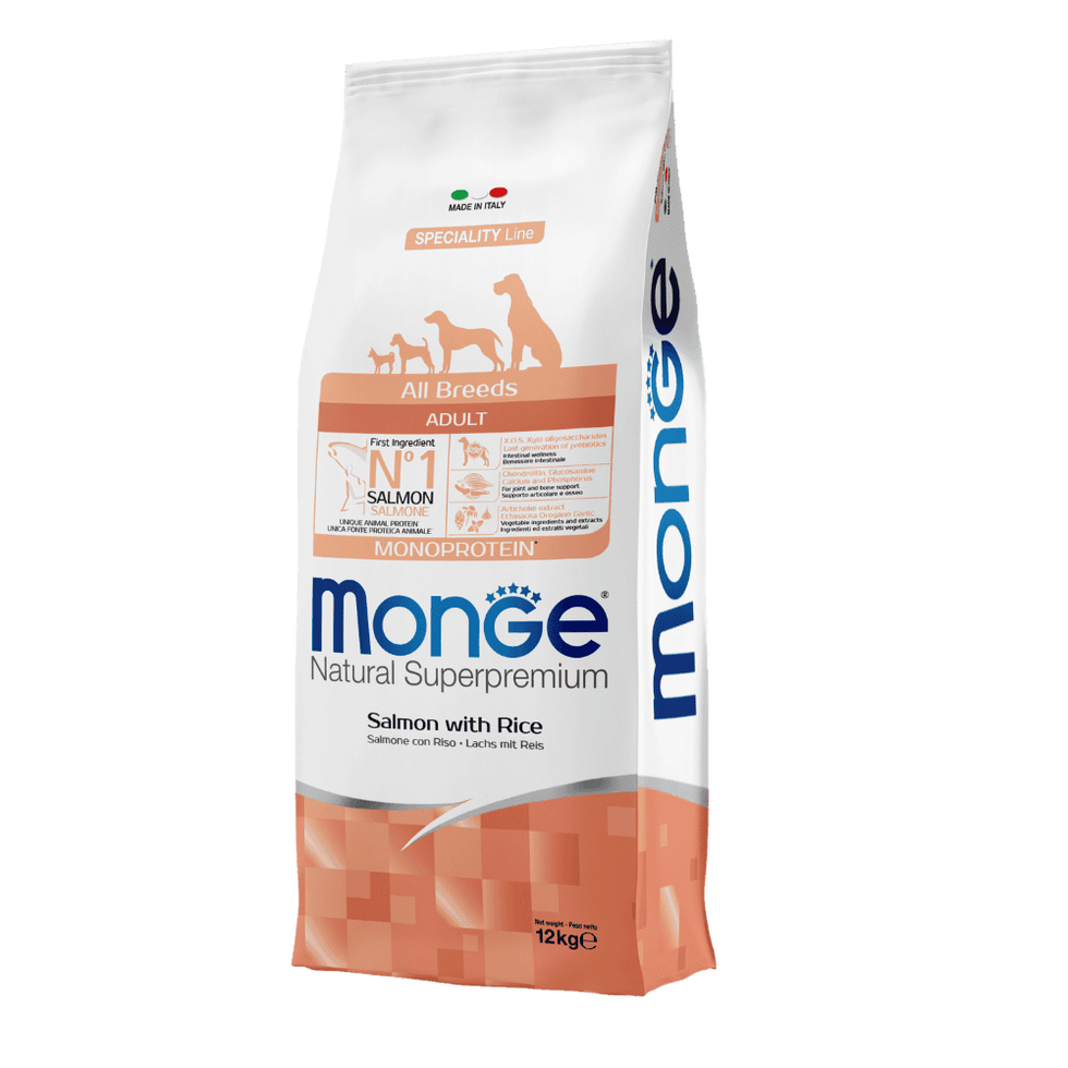 מונג׳ אדולט סלמון הוא מזון יבש לכלבים בוגרים המכיל סלמון עשיר באומגה 3 ו-6, המסייע לשיפור מראה העור והפרווה. מתאים במיוחד לכלבים רגישים בזכות הרכיבים הקלים לעיכול והטעימות הגבוהה שלו.